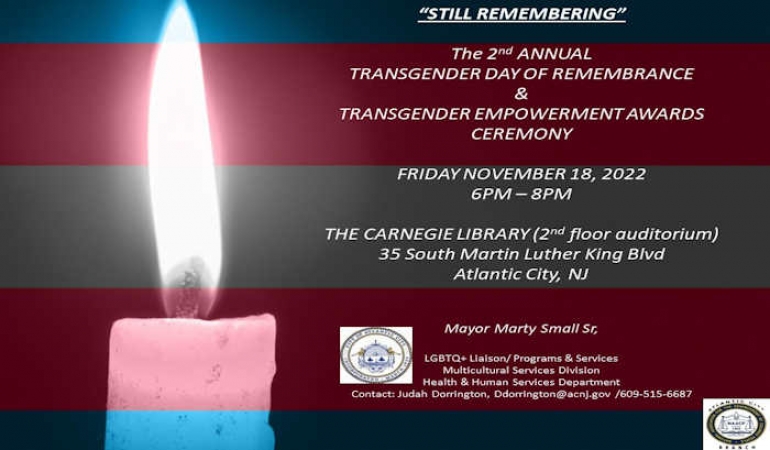 The City of Atlantic City LGBTQ+ Programs and Services and The Atlantic City NAACP LGBTQ+ Silver Linings Committee, along with our 2022 Transgender Day of Remembrance Committee Ten'e Long, Ebony Hickson, Seng Cox, and Phantyzee Diore invite you to Celebrate Transgender Day of Remembrance and Empowerment Awards Ceremony.