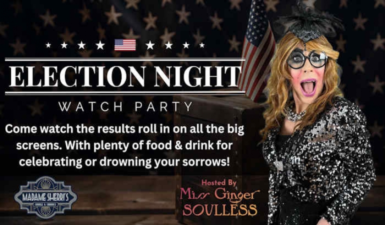After you do your civic duties, join us for the Election Night Watch Party at Madame Sherri's.