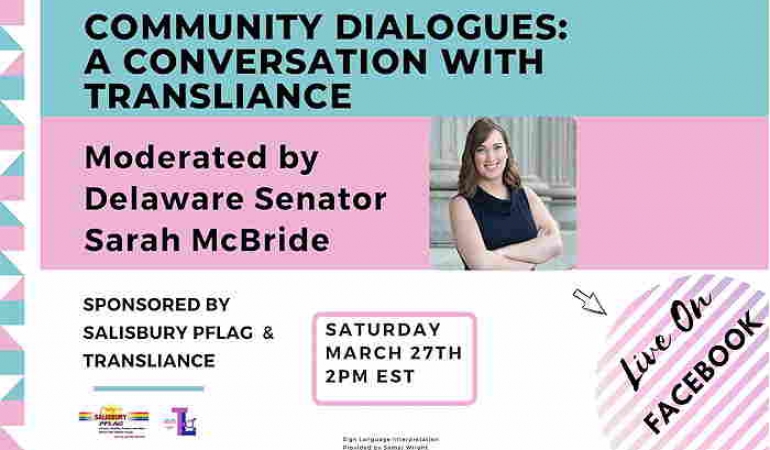 We are proud to present, in honor of Transgender Awareness Week, a Community Dialogue offered in partnership with Salisbury and Rehoboth transliance. This event will be live-streamed on the Salisbury PFLAG Facebook page on March 27, 2021 at 2pm. Please join us for this important event. We are honored to have Delaware State Senator Sarah McBride serve as Moderator for this important conversation, which will bring attention to the needs and issues that are facing our trans family, friends, and loved ones. Please see the linked press release for additional information.