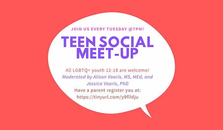 We are excited to announce that we will be offering WEEKLY teen social meet-ups! Meetings will be online via the Zoom platform and facilitated by Alison Vooris, MS, MEd, and Jessica Vooris, PhD. A PFLAG Board Member will serve as moderator.