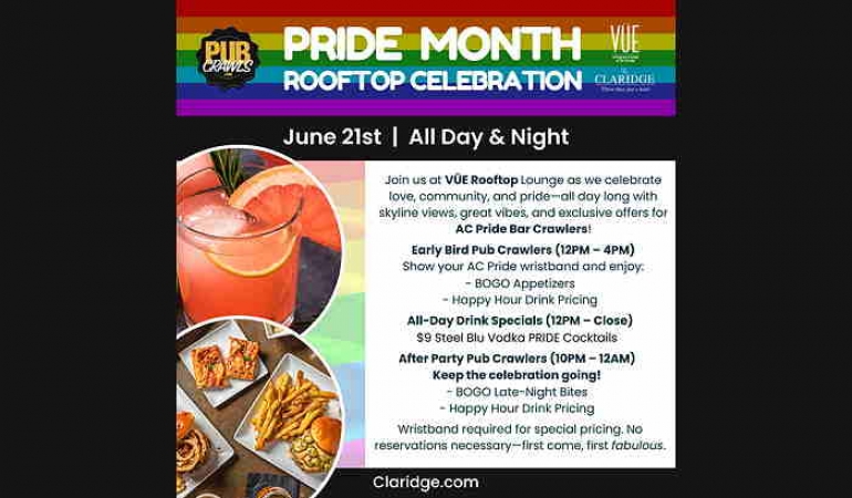 June 21st | All Day & Night: Join us at VÜE Rooftop Bar & Lounge as we celebrate love, community, and pride—all day long with skyline views, great vibes, and exclusive offers for AC Pride Bar Crawlers!