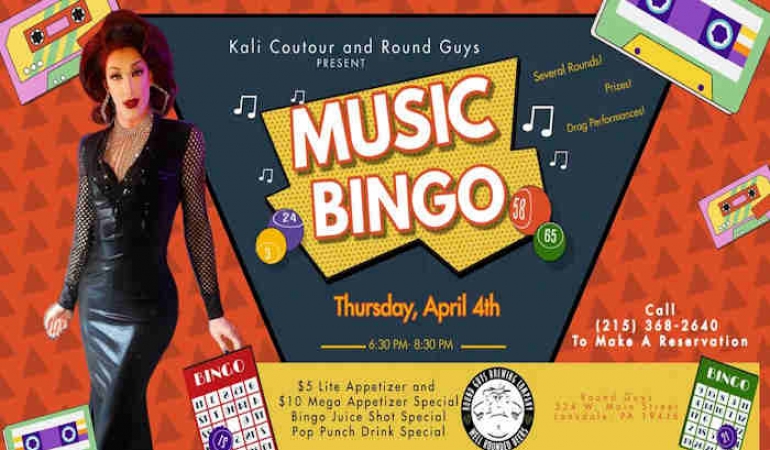 Come join the fun! FREE TO PLAY, come join host Kali Coutour for some music bingo! With at least 4 rounds, sit back and listen to music and win prizes! Please call (215) 368-2640 for reservations!