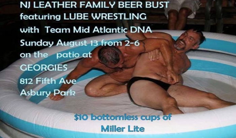 It’s another Jersey Leather Family Beer Bust, and the men of Team Mid Atlantic DNA are going to make sure it’s hot and sticky with an afternoon of Lube Wrestling. Give it a try if you’d like or just “like to watch”. Sunday August 13, from 2-6 on the patio at GEORGIES. $10 gets you unlimited refills of a big red cup of Miller Lite Draft. Miss Lisa will be taking care of you at the full service bar, and Stacey will have a special Beer Bust Menu from GEORGIES Kitchen, and of course as always debauchery will run amuck, DRUMMERTRASH style.