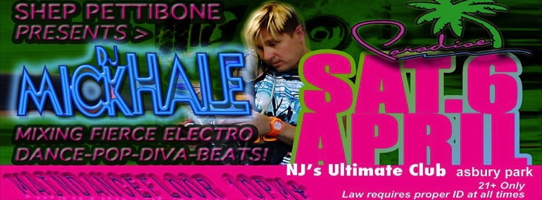 Shep Pettibone presents dj Mick Hale 1st SAT (April 6th) in the newly redone main dance-room at PARADISE spinning the freshest Pop-Diva Electro Remixes...