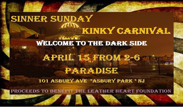 Step right up to Sinner Sunday’s Kinky Carnival. Hosted by Mr NJ Leather 2018 and the NJ Leather Family, experience a festival of fetish, a side show of new sensations, a bacchanal of debauchery. Take advantage of our paddling and flogging station, play kinky boardwalk games, revel in some rope play, experiment with hot wax or electro play, be loved on by bootblacks, and of course there will be puppies. Proceeds to benefit the Leather Heart Foundation. April 15 from 2-6 at Paradise in Asbury Park NJ. Welcome to the Dark Side.