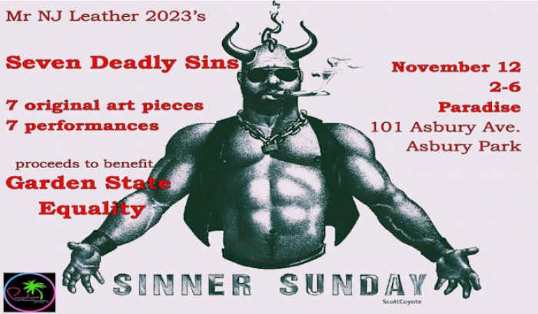 Mr NJ Leather 2023 invites you to Sinner Sunday’s Seven Deadly Sins, a fundraiser for Garden State Equality. Join Michael and the NJ Leather Family as we poke at, delve into, explore, and savor envy, greed, lust, wrath, sloth, gluttony, and pride. Experience seven performances and bid on seven original pieces of art, each depicting one of the “sins.” It’s an interactive event, and sinful & devilish attire is encouraged.