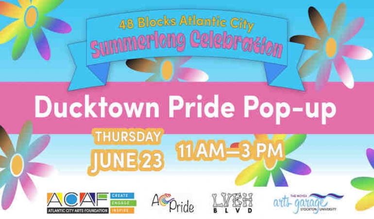 Ducktown Pride Pop-Up is presented in partnership with AC Pride and Arts Garage AC, featuring a drag queen story hour with Brittany Lynn from 11-12, the unveiling of a new mural by Victoria Katherine, and a pop-up pride art market.