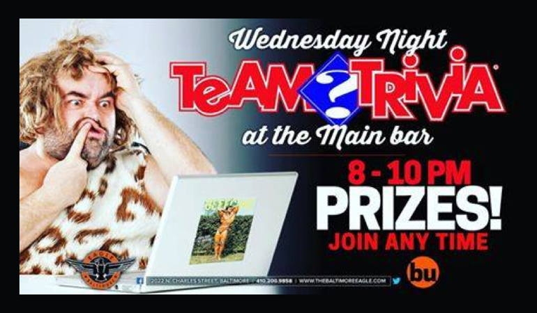 Every Wednesday, gather your team together and prepare to fight it out at Team Trivia Baltimore in the main bar! No cover! Wednesday food and drink specials! Fabulous prizes available for the winning team!