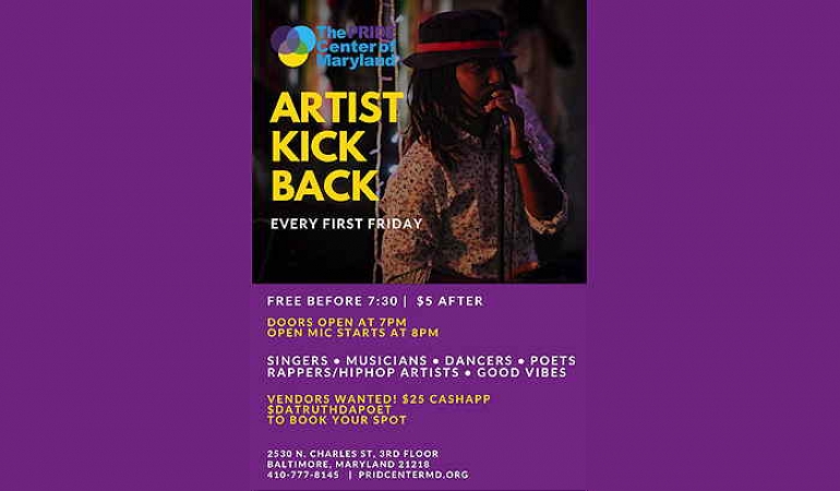 The Pride Center of Maryland(PCOM) presents The Artist Kick Back formally Giovanni's Room Open Mic. The Artist Kick Back is a monthly open mic that seeks to support Baltimore's LGBTQ+ artists and entrepreneurs by providing a platform to share, sell, and support. This space is affirming of all sexualities, gender identities, and gender expressions.