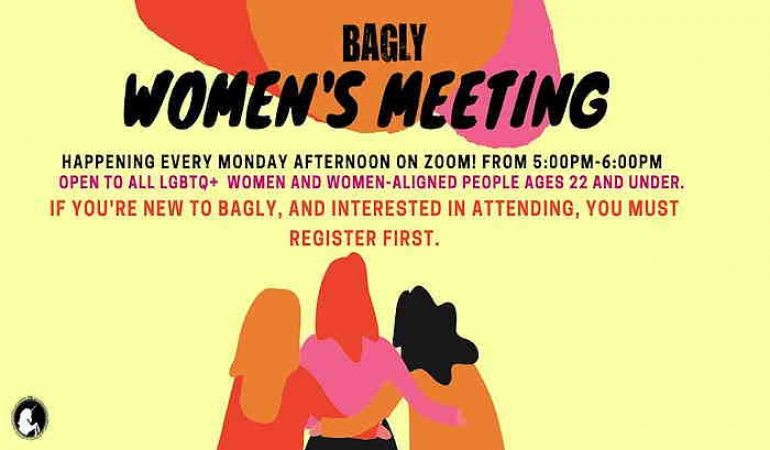 We're hosting our Women's Meeting on Zoom! Join us from 5PM-6PM. Our Women's Meeting is open to all LGBTQ+ women and women-aligned people ages 22 and under.