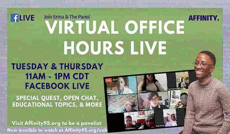 Virtual Office Hours is a weekly program hosted on Tuesday and Thursday from 11AM-1PM CT. We bring engaging and educational programs in an informal virtual setting live-streamed on Facebook. We offer on community an opportunity to join the Livestream via Zoom.