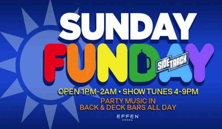 Sunday Funday Show Tunes are a Sidetrack Tradition. Join us every Sunday for Show Tunes from 4-9pm with your favorite Broadway and Movie Musical videos. Enjoy Party Music in Back and Deck Bars all day.