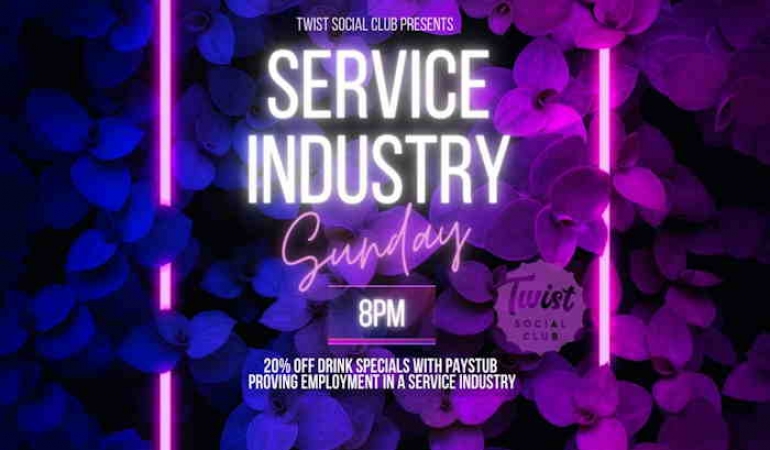 Join us every Sunday night for a service industry night at 8pm. Enjoy a 20% discount on drinks.