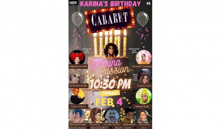 You are all invited to Karinas Birthday Cabaret! Let's all come together to celebrate the 33rd Bday of one of our newest members of the Drag scene here in the Quad Cities.