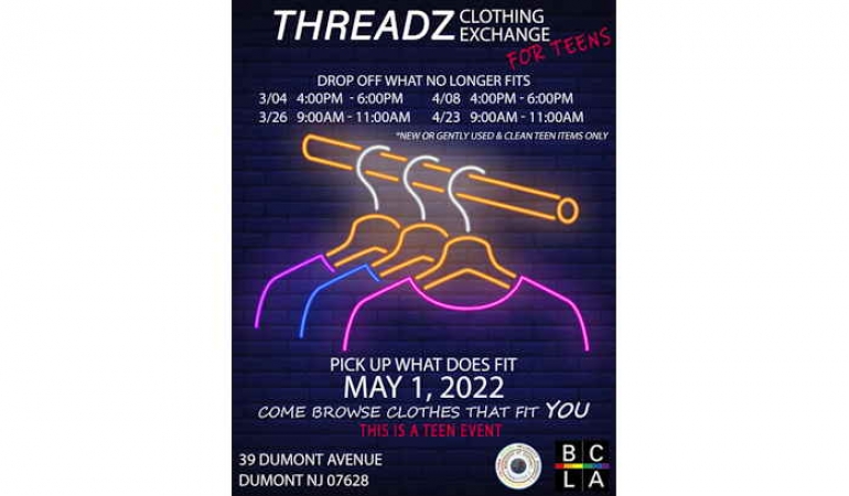 The Threadz Clothing Exchange gives Teens a chance to donate what doesn't fit them and pick up clothes that do fit. New or gently used and clean items only. The exchange happens at the Dumont Senior Center.