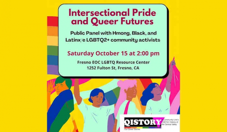 Fresno is an area of amazing LGBTQ+ diversity, yet often this diversity is overlooked or not given equal access to resources. This panel is meant to be an engaging conversation between community members, organizers, and activists addressing the intersections of race, income, sexuality, immigration, and gender for Hmong, East Asian, Black, and Latine/x queer communities in Fresno. Panelists include Alex Sanchez (Barrios Unidos), Shai Chang (Queer Hmong Intersectional Pride), Alexandria Benn (Poet & Community Outreach Coordinator), and Diana Feliz Olivia (Community Interventionist, Centerforce).
