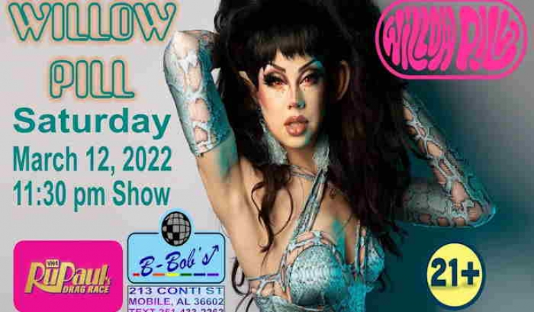 RPDR S14 performance artist Willow Pill will be at B-Bob's Saturday, March 12, 2022!