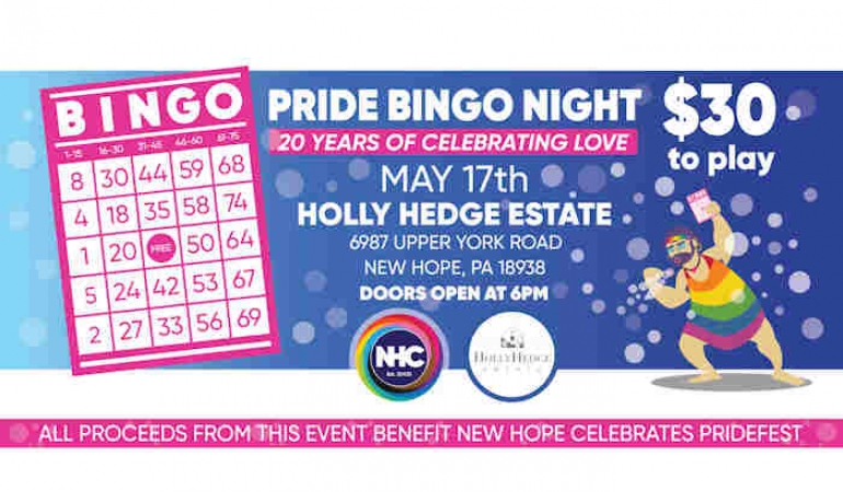 2023 Pride Bingo – 20 Years Celebrating Love – Presented by New Hope Celebrates – Celebrating May PrideFest 2023. This special event will take place at the fabulous HollyHedge Estate in New Hope, PA, on Wednesday, May 17th. Hosted by New Hope’s own Miss Pumpkin and Friends.