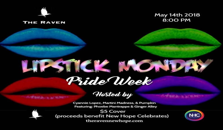 The Raven presents the Lipstick Monday Pride Show featuring your co-hosts: Cyannie Lopez, Martini Madness, and Pumpkin with guest performers Phoebe Mantrappe and Ginger Alley. There is a $5 Cover at the door that will benefit New Hope Celebrates.