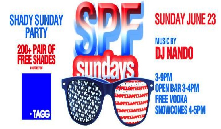 This Sunday is our "Shady Sunday" party at SPF with DJ NANDO! We will be giving away over 200 pair of sunglasses [different colors] courtesy of TAGG!