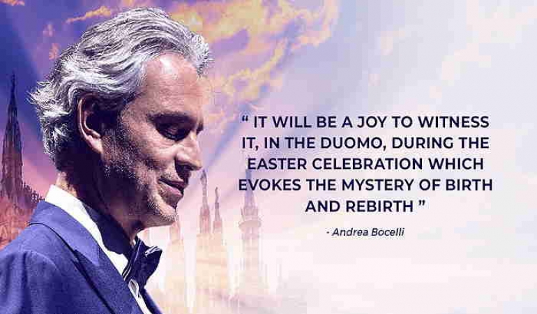 On Easter Sunday (April 12, 2020), by invitation of the City and of the Duomo cathedral of Milan, Italian global music icon Andrea Bocelli will give a solo performance representing a message of love, healing and hope to Italy and the world. Watch live here at 10am LA, 1pm NYC, 6pm UK, 7pm CET.