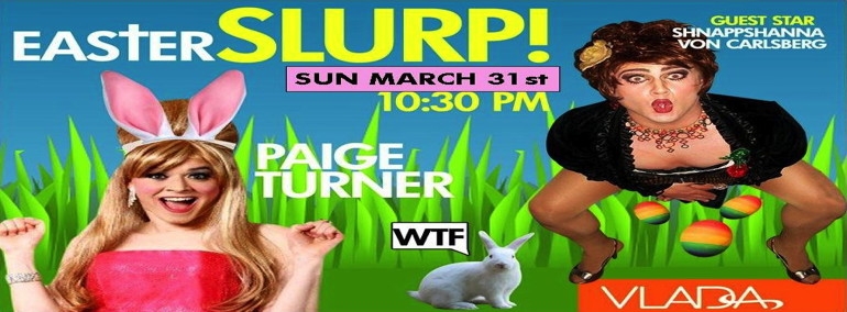 Join Showbiz Spitfire PAIGE TURNER for SLURP-her long running weekly variety show -showstopping numbers with a little tawdry on the side, games, prizes and mayhem! ! join me and Danish Delight Shnappshanna Von Carlsberg! Eggs, Rabbits, Jesus, Holy Water and DJ Billy! videos, shenanigans, prizes and plenty of slurps!