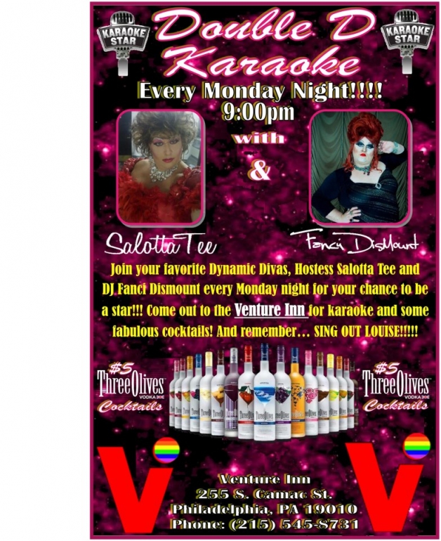 Monday Night at 9pm The Venture Inn and THREE OLIVE COCKTAILS presents DOUBLE D KARAOKE!!!! Hosted by two Double D Girls themselves Salotta Tee & Fanci DisMount. So come out to the Venture Inn if you want to sing with the BIG GIRLS!!!!!