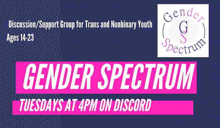 Gender Spectrum a peer-led, peer-focused support group for trans, questioning, gender-expansive and gender-non-conforming youth between the ages of 14 and 23, in the form of a casual social hour. We meet weekly on Tuesdays via Discord from 4-5 pm. Topics range from the serious to the silly, and always with an emphasis on creating a safe space for youth to be themselves and discuss what’s happening in their lives.GS will continue to be facilitated by YPI Staff Lukas with Dev helping out.