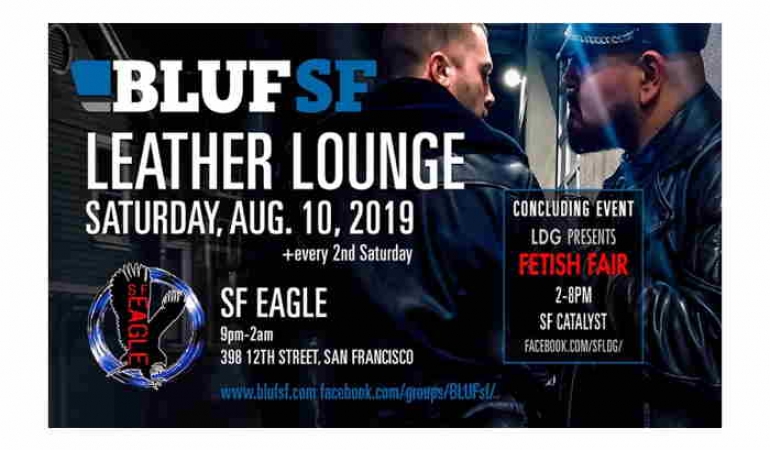 After LDG's Fetish Fair at SF Catalyst, 2-8pm, Aug. 10, BLUF SF's Leather Lounge is the place to put what you've learned into practice. In fact, whether you're a geared-up leatherman, or just learning, head to the SF Eagle EVERY 2nd Saturday of the month, 9pm-2am. And if you're in full gear, don't forget to mention BLUF SF at the door before 10pm... Join facebook.com/groups/BLUFsf/ for more info, special times/themes. For more info on this year's Fetish Fair, go to