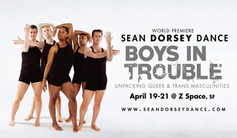 BOYS IN TROUBLE is performed by: Sean Dorsey, Brian Fisher, ArVejon Jones, Nol Simonse and Will Woodward. Original music composed by: Alex Kelly, Ben Kessler, Anomie Belle, LD Brown and Jesse Olsen Bay. Lighting Design by Clyde Sheets. Costume Design by Tiffany Amundson. Technical Direction by Emily A. Paulson.