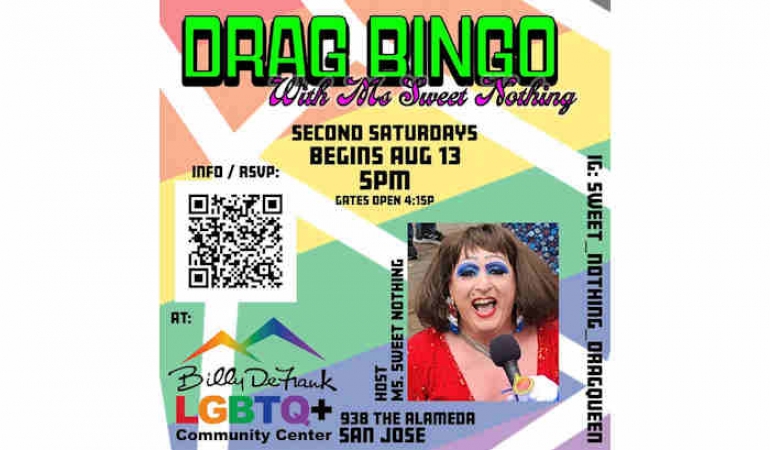 Starting Saturday, August 13th, as part of the 2nd Saturdays on The Alameda (arts and entertainment), Ms. Sweet Nothing is hosting DRAG BINGO at the Billy DeFrank Center, 938 The Alameda. The entrance is at the back of the parking lot. The gate opens 4:15PM, and the Games start 5PM.