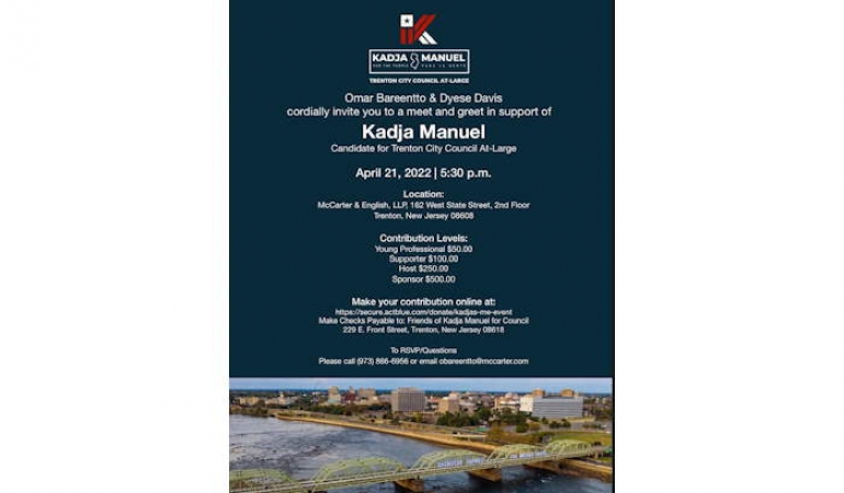 Omar Bareentto & Dyese Davis cordially invite you to a meet and greet in support of Kadja Manuel, Candidate for Trenton City Council At-Large.