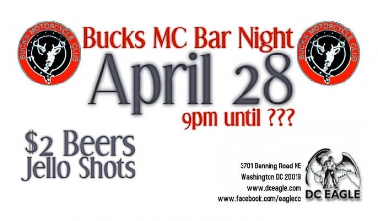 The BUCKS MC is excited to announce our first bar night of 2018 @ The DC EAGLE, April 28 starting at 9 PM in the club room. We will be serving beer for $2 and jello shots and possibly other goodies for your consumption.