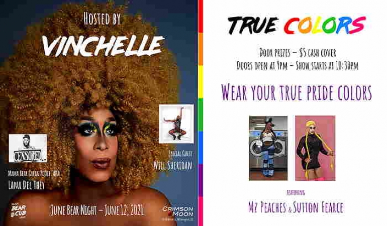 Show out your "True Colors". Door prizes, $5 CASH cover. The show starts at 10:30 featuring Vinchelle as your host with special guests: Mz Peaches, Sutton Fearce, Will Sheridan, and our very own Mama Bear Lana Del They! A night your not going to want to miss.