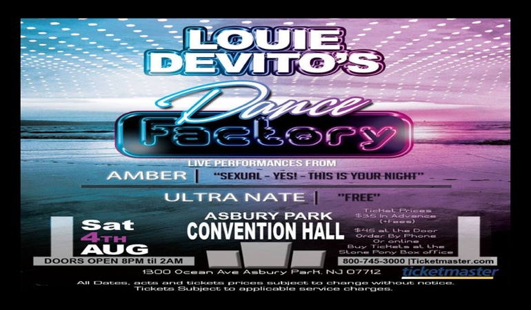 Louie DeVito's Dance Factory returns to Convention Hall on the Asbury Park Boardwalk. Featuring live performances from Amber singing all her hit songs including "Sexual", "Yes!", "This Is Your Night" & "One More Night" and Ultra Nate singing her club anthem "Free"! Louie will be spinning an open to close set from 8pm until 2am!!