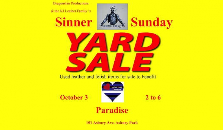 Sinner Sunday, The NJ Leather Family’s “almost” monthly social is back at Paradise, and we’re holding a Yard Sale: boots, vests, kilts, chaps, harnesses, event t-shirts and fetish items all previously owned and well loved and it’s all to benefit the Leather Heart Foundation.