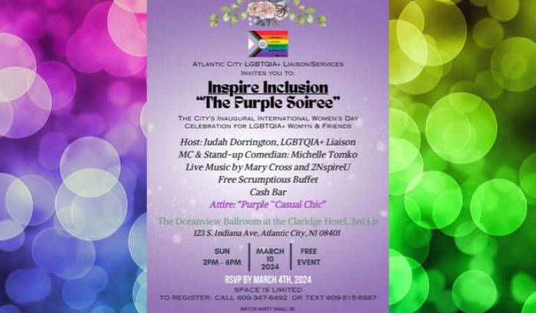 Atlantic City's Inaugural International Women's Day Celebration for LGBTQIA+ Womyn & Friends! Hosted by Judah Dorrington, our LGBTQIA+ Liaison, with hilarious stand-up comedy by Michelle Tomko and live music by Mary Cross and 2NspireU.