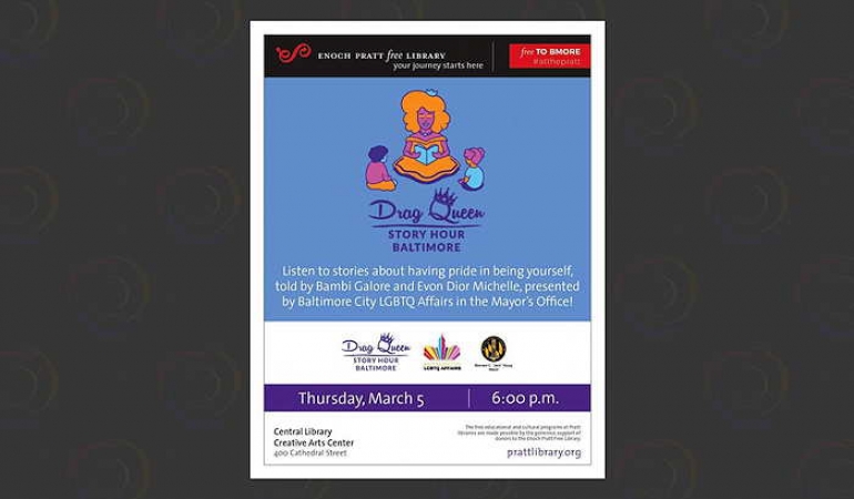 Join us for our very first, very special Drag Queen Story Hour event, presented by Baltimore City LGBTQ Affairs in the Office of Mayor Bernard C. "Jack" Young, in partnership with Enoch Pratt Free Library. The extremely talented Bambi Galore, former Baltimore Queen of Pride, and the powerhouse Evon Dior Michelle, both local veteran drag performers, will appear in painted face and beautiful dress to read stories to Baltimore's youth and families, featuring themes about acceptance and pride in oneself.
