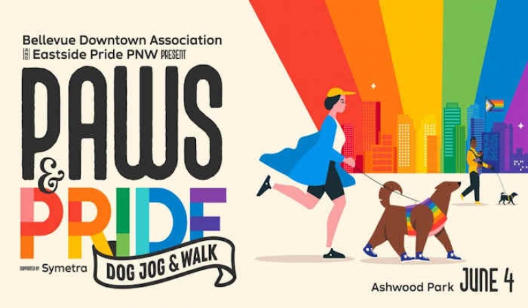 The Eastside welcomes Pride Month with the first-ever LGBTQIA+ dog jog & walk in Downtown Bellevue! The Bellevue Downtown Association and Eastside Pride PNW are proud to debut the inaugural Paws & Pride Dog Jog & Walk, supported by Symetra, on Sunday, June 4 at Ashwood Park – adjacent to Bellevue Library.
