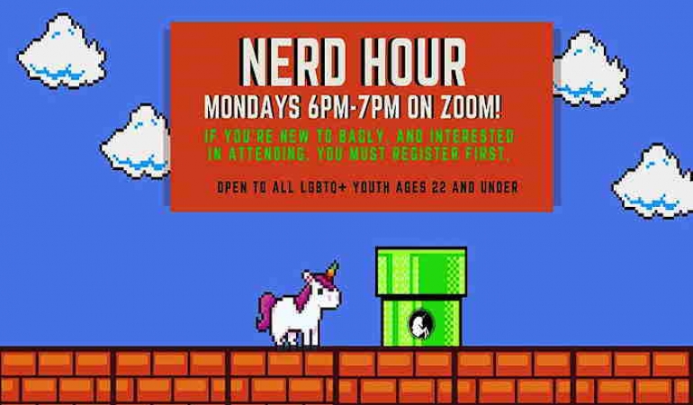 We're hosting Nerd Hour on Zoom! Nerd out with us on topics surrounding pop culture, comic books, anime, fandoms, etc. Open to all LGBTQ+ youth ages 22 and under.