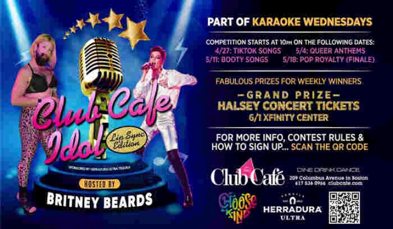 Britney Beards hosts our first Club Cafe Lip Sync Idol! Go head to head against other patrons in lip-syncing iconic songs for your chance to win weekly prizes. Our grand prize includes tickets to Halsey and a Karaoke line skip pass for one year!