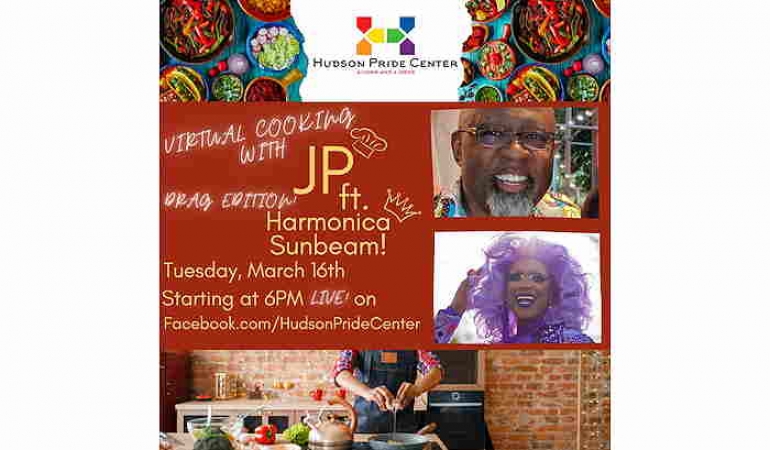 Jersey City Drag Icon Harmonica Sunbeam will be joining JP for Virtual Cooking on March 16th starting at 6PM LIVE! on Hudson Pride Center's Facebook page.