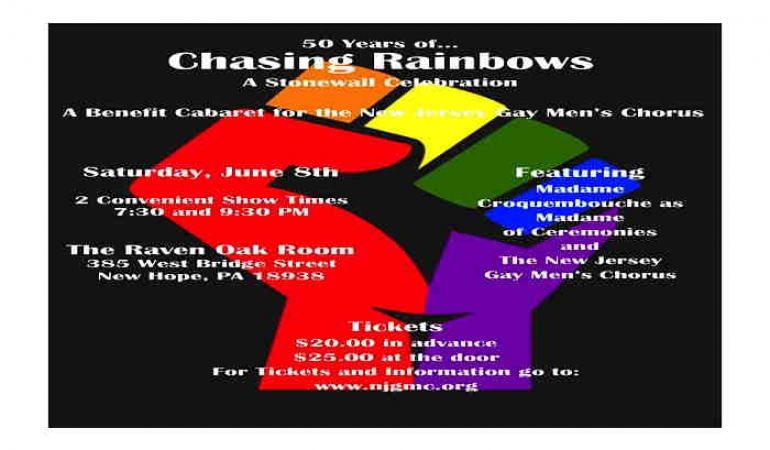 The New Jersey Gay Men’s Chorus presents our pride cabaret “50 Years of Chasing Rainbows. A Stonewall Celebration” on Saturday, June 08, 2019 at 8:00pm, at The Raven’s Oak Room, 385 West Bridge Street, New Hope PA, 18938.