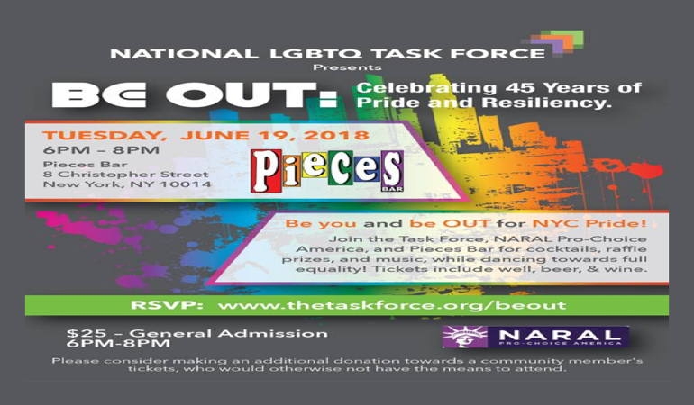 Be you and be OUT for NYC Pride! Join the Task Force, and our community sponsors NARAL Pro-Choice America and Pieces Bar for cocktails, raffle prizes, and music. Let's dance towards full equality, toast to the spirit of giving and celebrate LGBTQ resiliency! Tickets are $25 and include well cocktails, beer, & wine.