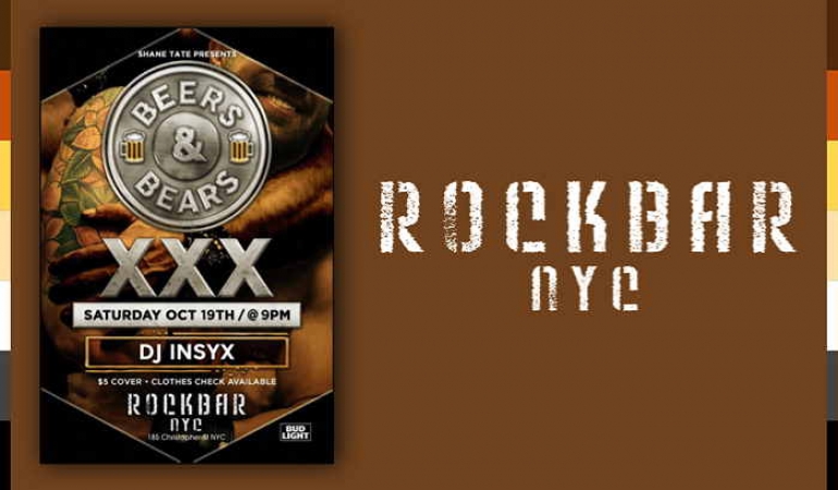 Beers & Bears come to ROCKBAR NYC! Saturday, October 19th, 9PM Shane Tate throws the XXX version of Beers & Bears with hot GoGo Bears, amazing music by yours truly, DJ InsyX, and the ability to set yourself free... Jocks and gear encouraged but not required. Clothing check available. $5 cover.