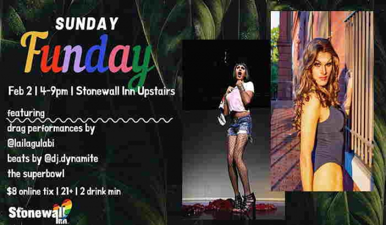 Miss Laila Gulabi (@lailagulabi) makes her Stonewall Inn debut with 5 hours of drag shows, dancing, games and the Super Bowl all rolled into one cray-cray SUNDAY FUNDAY day party!