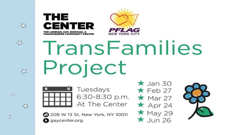 PFLAG NYC, in partnership with The Center, invites parents, family members and friends of transgender and gender nonconforming loved ones to the TransFamilies Project, a monthly support group.