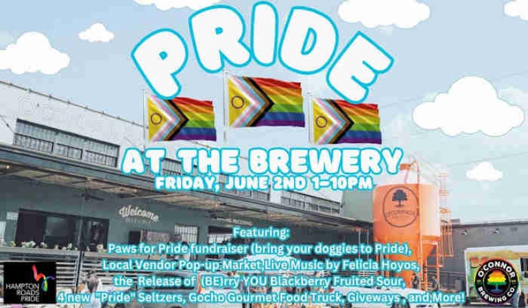 Join everyone for PRIDE at the Brewery next Friday, June 2nd from 1-10pm as we kick off Pride Month in Hampton Roads. Starting at 1pm, our special Pride Happy Hour will feature ALL OBC Flagship pours and Seltzers for just $5 bucks til 6pm!
