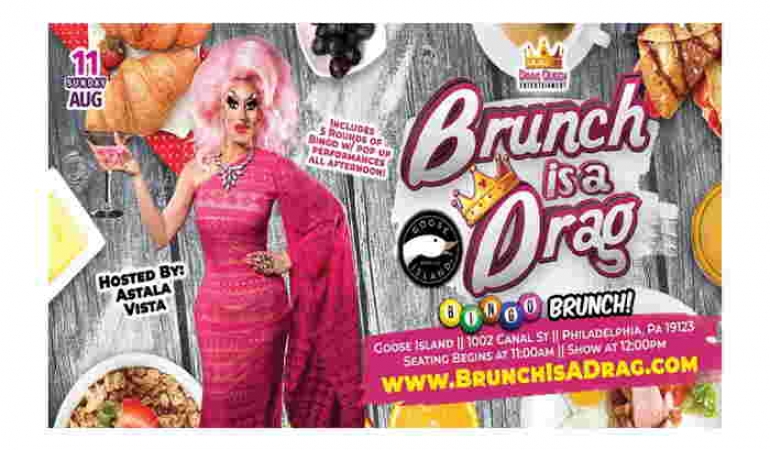 Join Drag Hostess, Astala Vista on Sunday, August 11th for Brunch is a Drag! - Drag BINGO Brunch, an afternoon of Delicious Food, Refreshing Cocktails, & Fabulous Queens! If you’re looking for flawless make-up, incredible costuming, and an all around great afternoon for your family & friends, then throw on some glitter and Drag yourself to Brunch is a Drag!