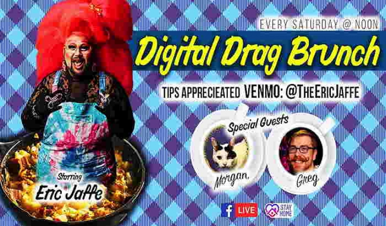 Hello QuaranQueens! We're back! Get ready for the third-ever Digital Drag Brunch! We're back on Saturday 4/18 at NOON with a brand new show, Starring Eric Jaffe, Greg, and Morgan the cat! Special guest: YOU! We will have brand new interactive segments! BYO EVERYTHING! NO COVER! DRINK SPECIALS! You make the drinks, and that's special! Show off your brunch looks and plates in the event!!! Let's put the social back in the social distance! Invite your friends to tune in with you!!